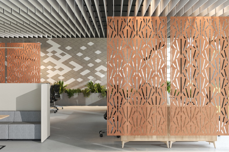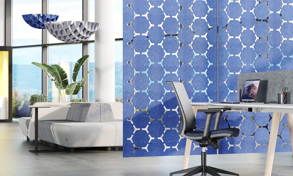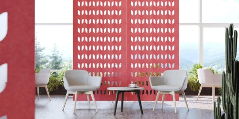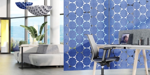 Available in a variety of colours, patterns and shapes. The wide selection of colours, patterns and shapes of the acoustic PET felt products gives you the opportunity not only to ensure acoustic comfort for employees but also to realise unique design ideas, overcome the challenges of furnishing spaces and emphasise the distinctiveness of your interior design style.