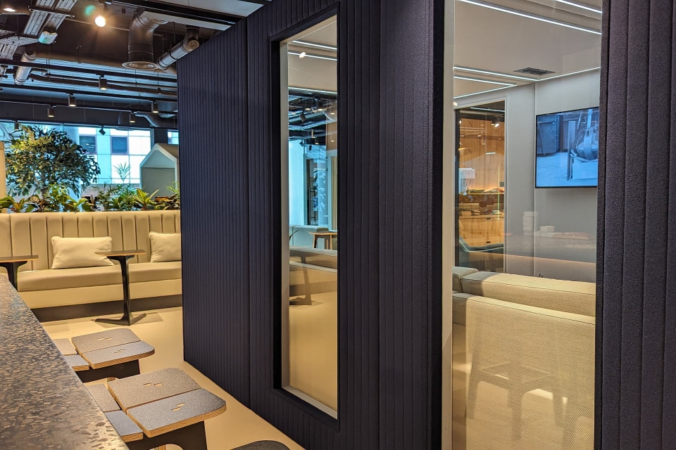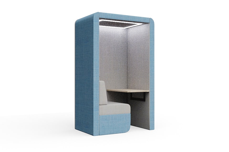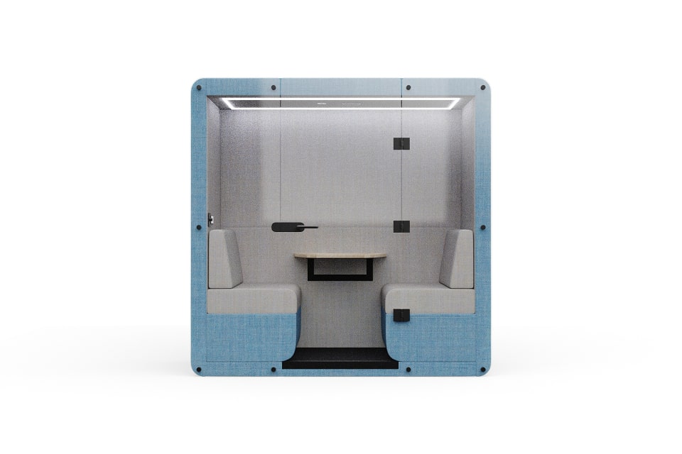 Designed with comfort and acoustic performance in mind, it features upholstered panels and rounded corners to absorb sound and create a comfortable atmosphere.