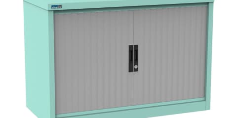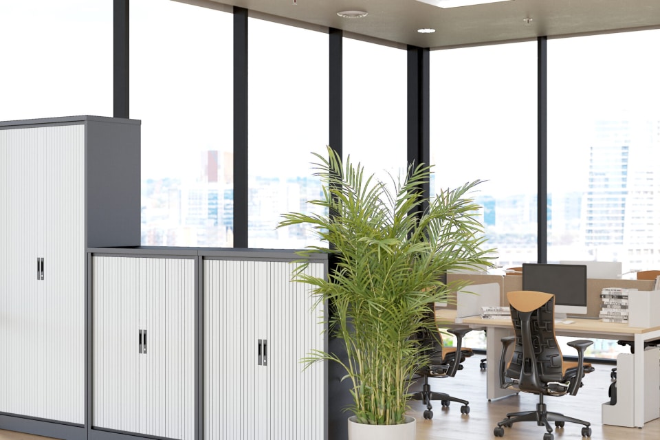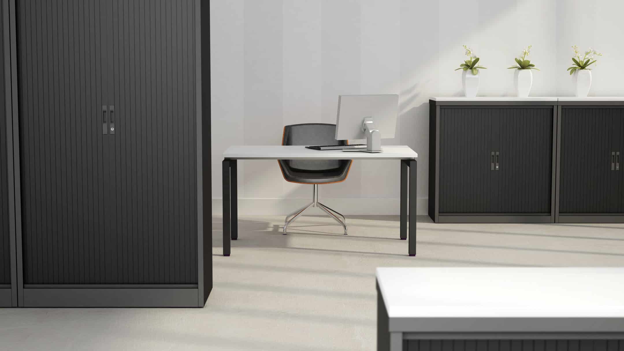 A neat design, the tambour blind itself retracts fully into the unit, eliminating the potential issue of doors and drawers restricting people from flowing through the workspace easily.